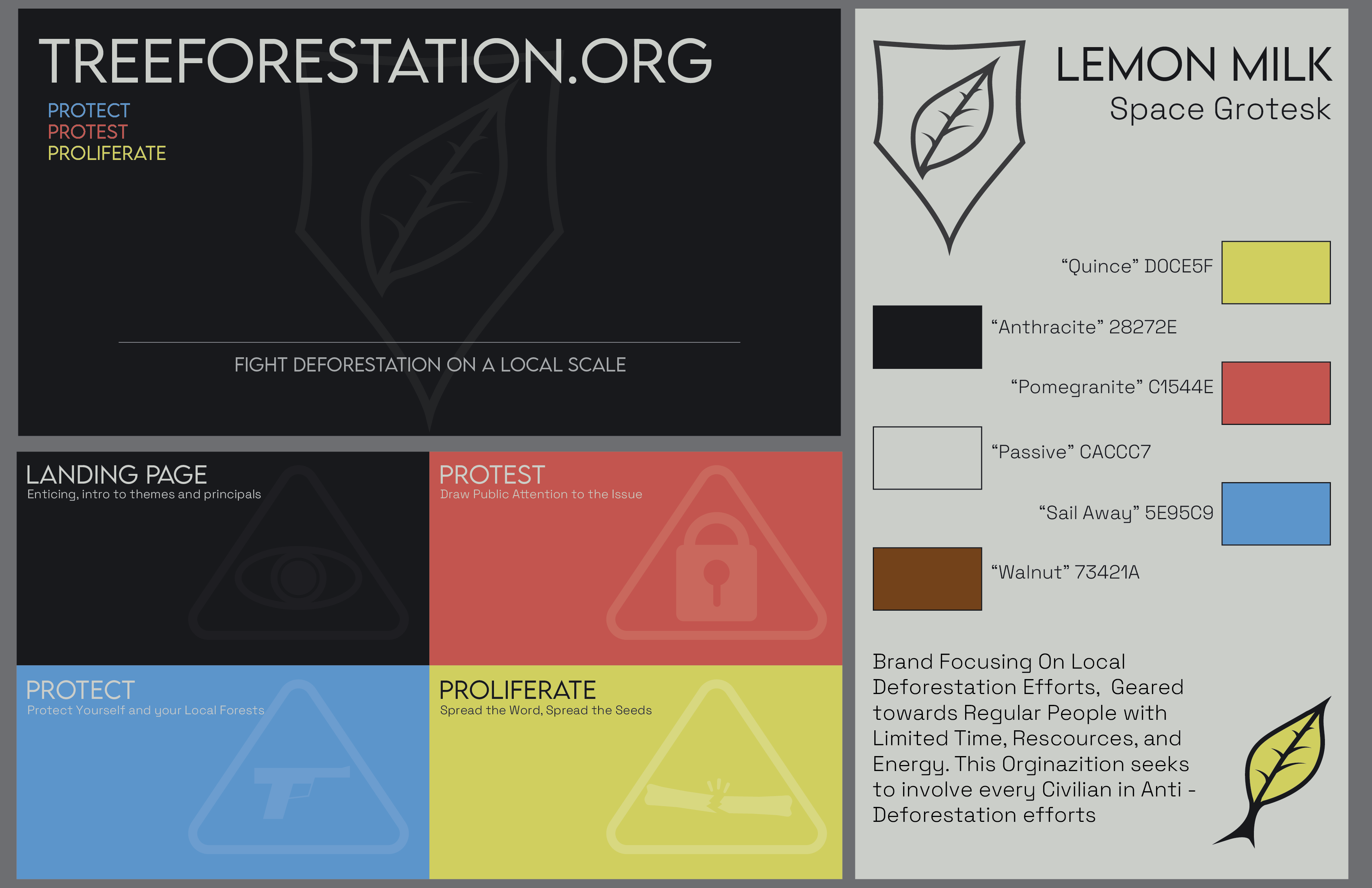 Treeforestation is a brand identity for an imaginary environmental nonprofit. Focusing on actionable resistance to deforestation and other ecosystem dangers, this nonprofit would be a source of information and community, mainly via website. This prompt dictated how I designed for the brand. The environmental focus made concepting design simple, and the grassroots, actionable aspect invoked a screenprinted, minimal palette. This was inspired by Zine culture, independent media put out by small communities of passionate people, where resources are limited. Negative space, color, and complexity are all used sparingly, in the name of efficient communication. This is balanced with the still important need to draw the eye.