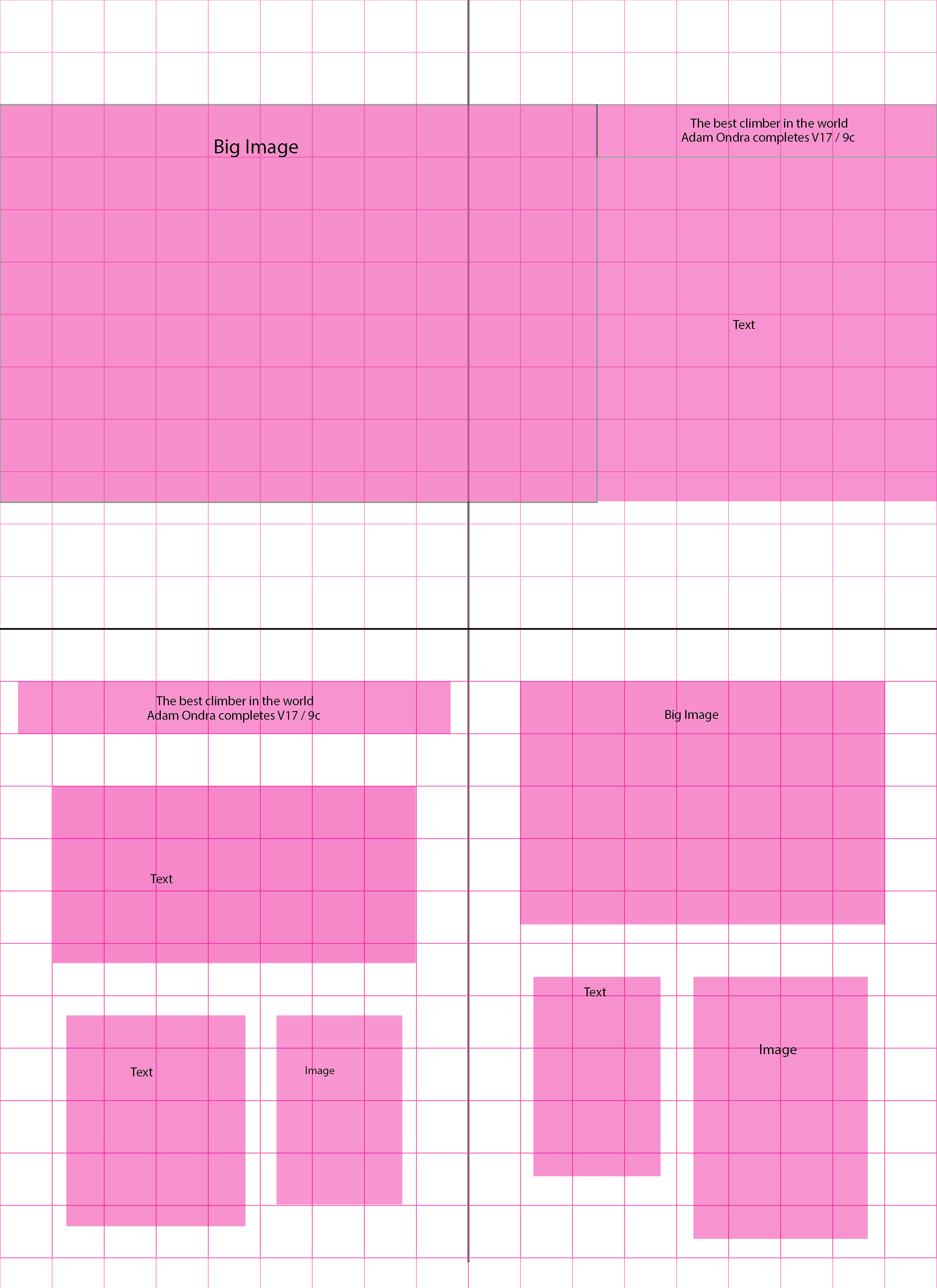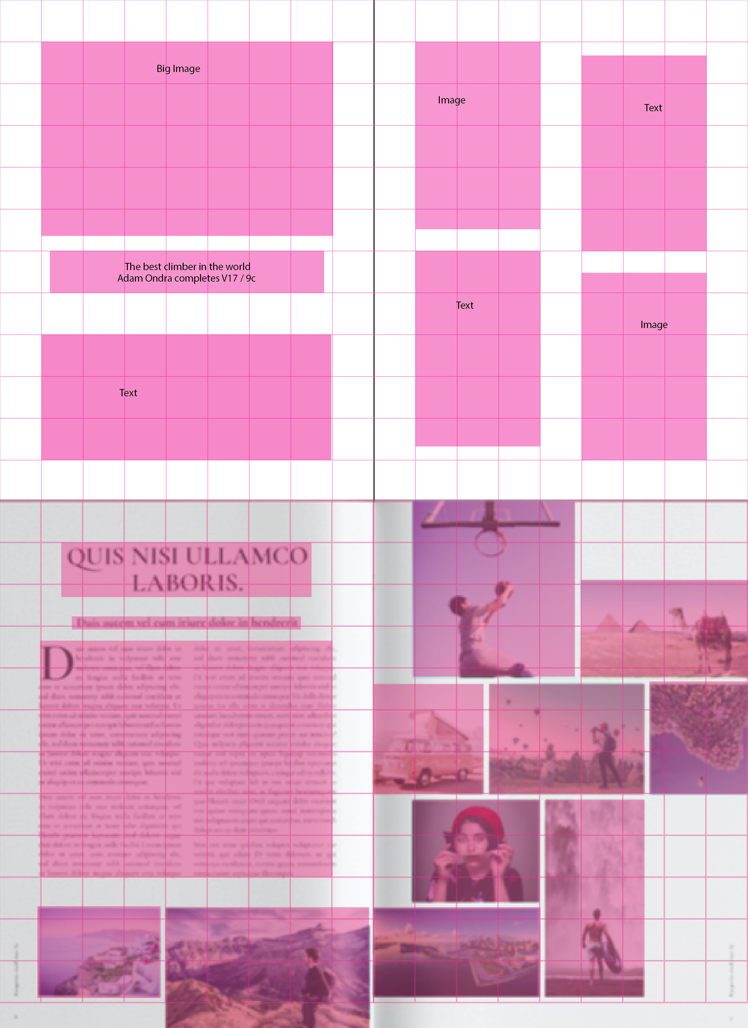 This is a poster with an accompanying essay written on the life and work of designer Jacqueline Casey. The essay focuses on her designs as the Director of Design and Media for the MIT press. Casey focuses on drawing the eye with minimalism, interesting layouts, and elements, highlighted further by her use of the Swiss Grid System. Learning from her, I used an asymmetrical layout and one central element to highlight the subject matter, draw the eye, then direct the eye towards the text. Essay Attached. Working with grids is an important step in analysing layout and planning content. To practice this, I studied some basic magazine designs, and wireframes over them, blocking out the layouts and creating a grid over the layout. Then I made some alternate layouts, labeling images and headlines.