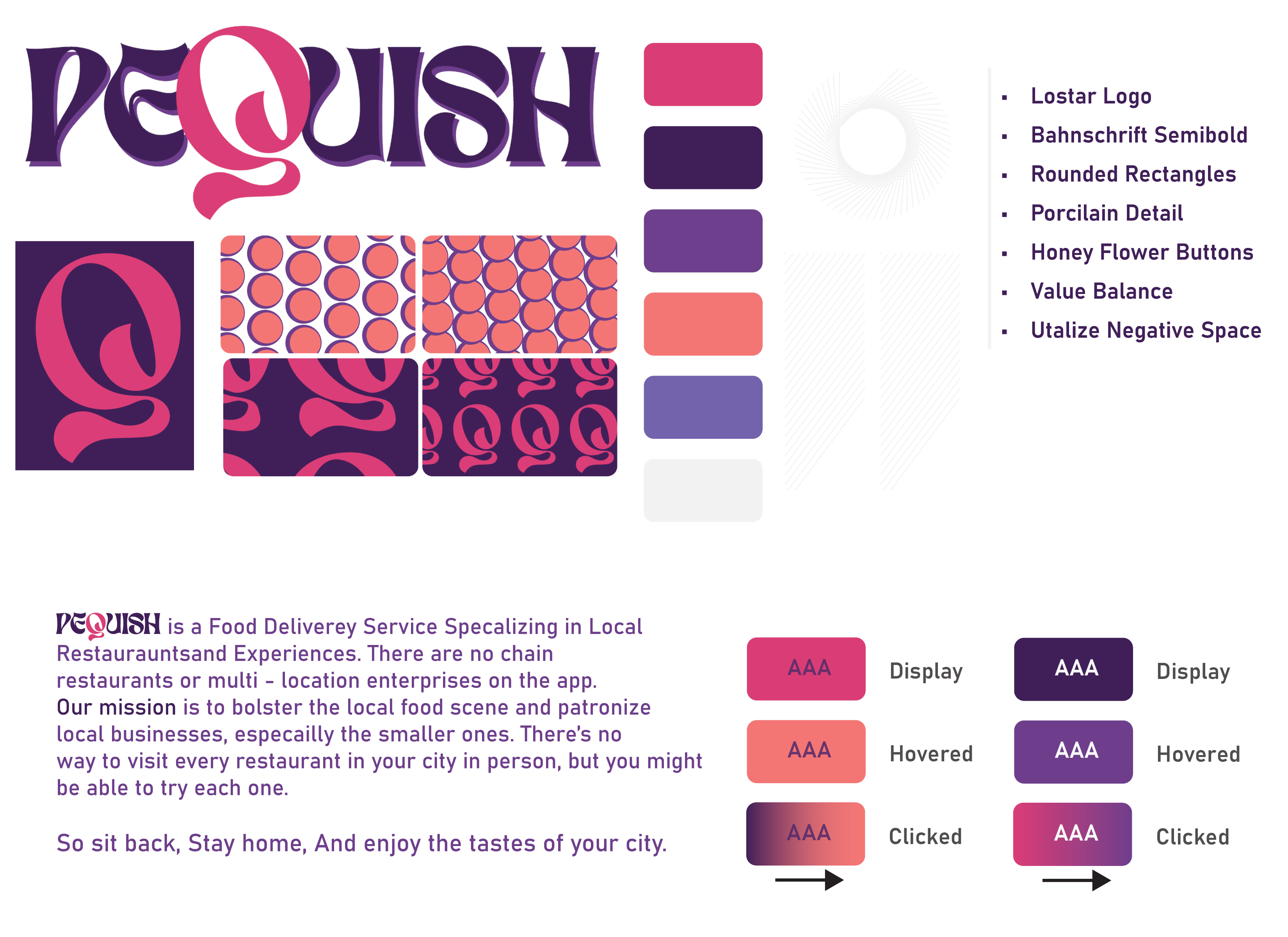 Pequish is a brand identity for a hypothetical food delivery service, specializing in smaller local cuisine. This was one of my first brand identities, but the brand idea was really fun and the elements just came together, so it's still one of my best. Going for a fun, showy identity, the bright palette and script logo work to create a light, bright, almost edible feel.